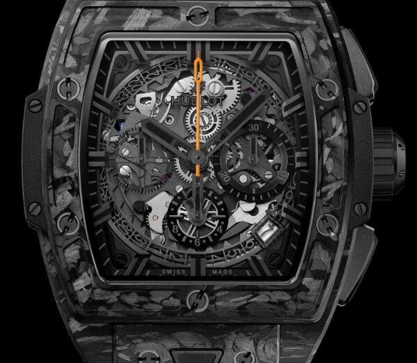 The dial and hands fitted to the new cheap fake Hublot Spirit of Big Bang Veuve Clicquot Polo Classic watches offer an identical design to what can be found on other chronograph-equipped models from the tonneau-shaped Spirit of Big Bang series, although it features an all-black design with a bright orange centrally-mounted seconds hand. Just as you would expect, the dial consists of a transparent sapphire sheet surrounded by a chapter ring containing the hour markers and minute track. However, all of the various elements that form the chronograph registers and indexes (plus the frames for the hands) are finished in either black or dark gray to match the hues of its forged carbon case, and this allows Veuve Clicquot’s shade of “yellow” (aka orange) to vividly stand out against the otherwise entirely monochromatic appearance of its display.