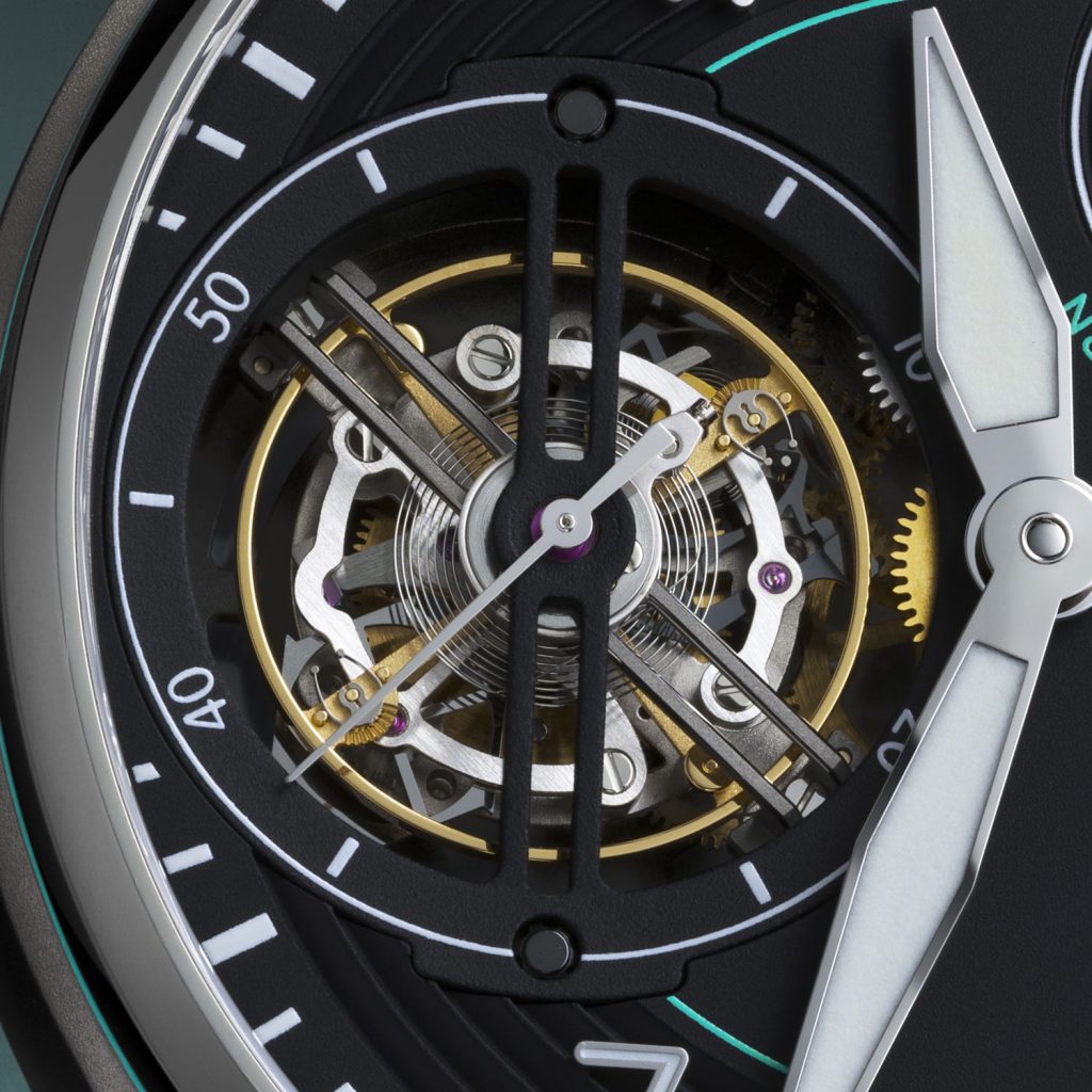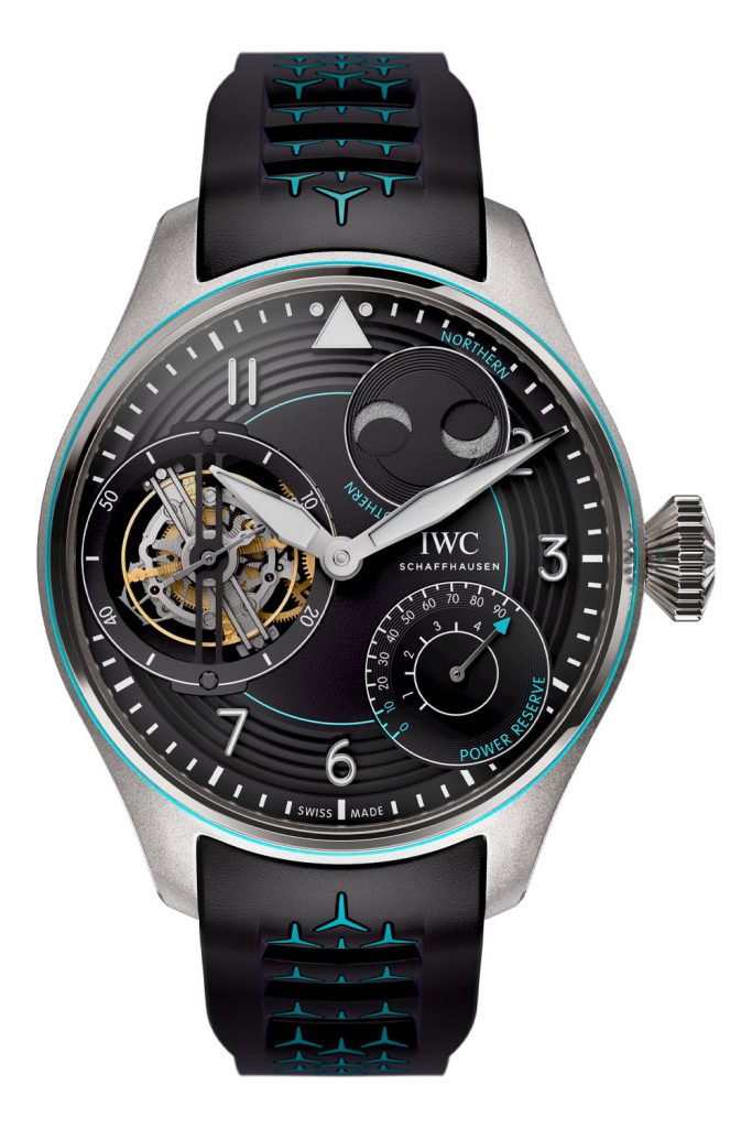 The black dial of the perfect fake IWC Big Pilot’s Watch Constant-Force Tourbillon Edition AMG One Owners IW590502 is classic to the collection, with oversized luminous hands and applied markers. It features a dual-moon for northern and southern hemispheres, a power reserve indicator and light green AMG-Petronas accents. The highlight is, of course, the massive tourbillon regulator and its constant-force device at 9 o’clock.