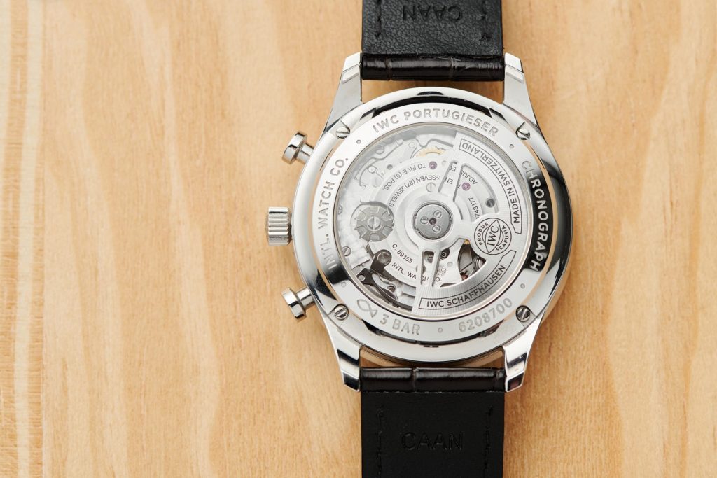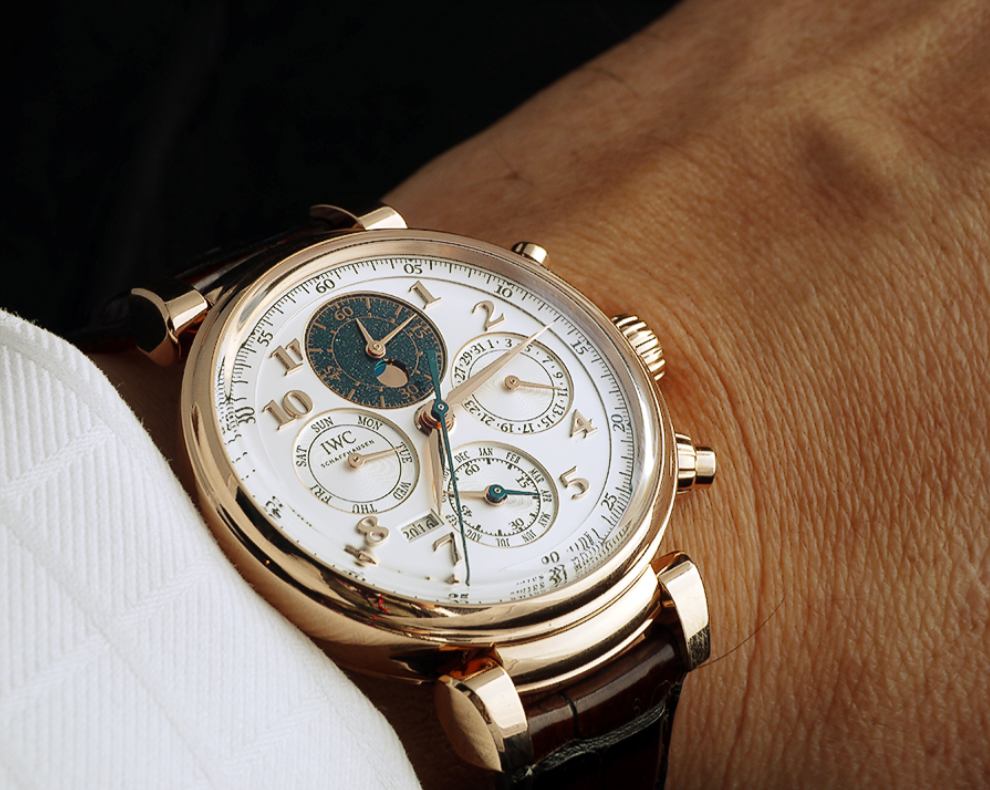 The movement is a modern 1:1 fake IWCdesigned and manufactured C. 89630 featuring a column wheel and flyback. A new perpetual calendar plate is used to keep with the dial layout of the 1985 variant. Activation of the chronograph is smooth with strong feedback, and judged to be perhaps a bit heavier than the others in this list, but still very pleasurable in actual use.