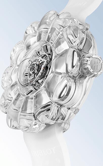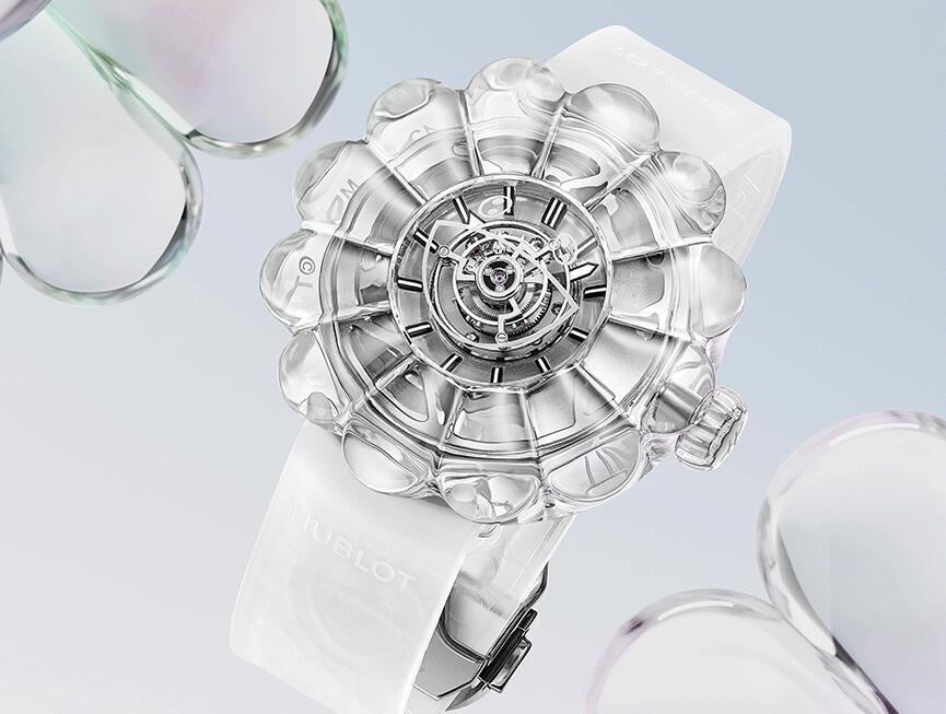 It is surrounded by Takashi Murakami’s iconic motif, a flower composed of 12 petals made entirely of sapphire. The flower features soft curves and bold, generous volumes. 1:1 cheap Hublot copy watches‘ aim was to create absolute transparency in order to maximise the luminosity of the MP-15: sapphire case, sapphire caseback, sapphire crown, translucent flange and strap. The sun will never merely shine on this floral work of art: it will pass straight through it, illuminating its curves and reliefs.